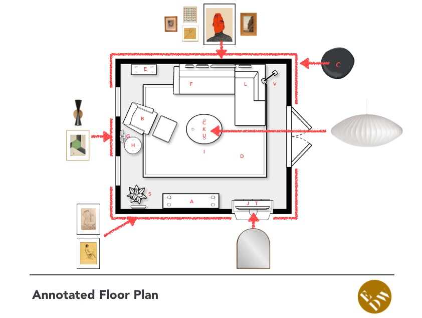As a client, you will be provided with a floor plan layout of your home. Because clients will install their space on their own, this plan will include a numerical system indicating where to place the products in your home. You’ll also be provided with hanging dimensions and installation instructions. See examples below!